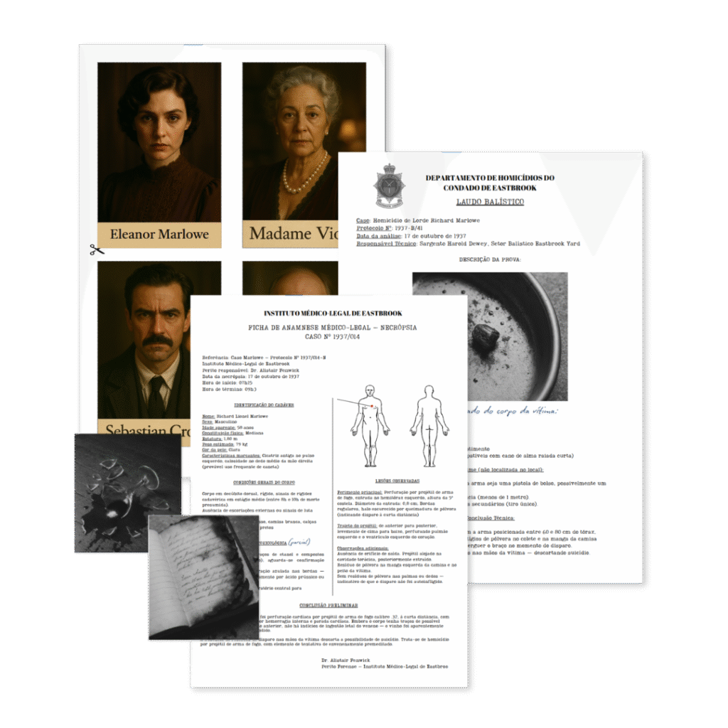 Analise os documentos, conecte evidências e siga os rastros do culpado.